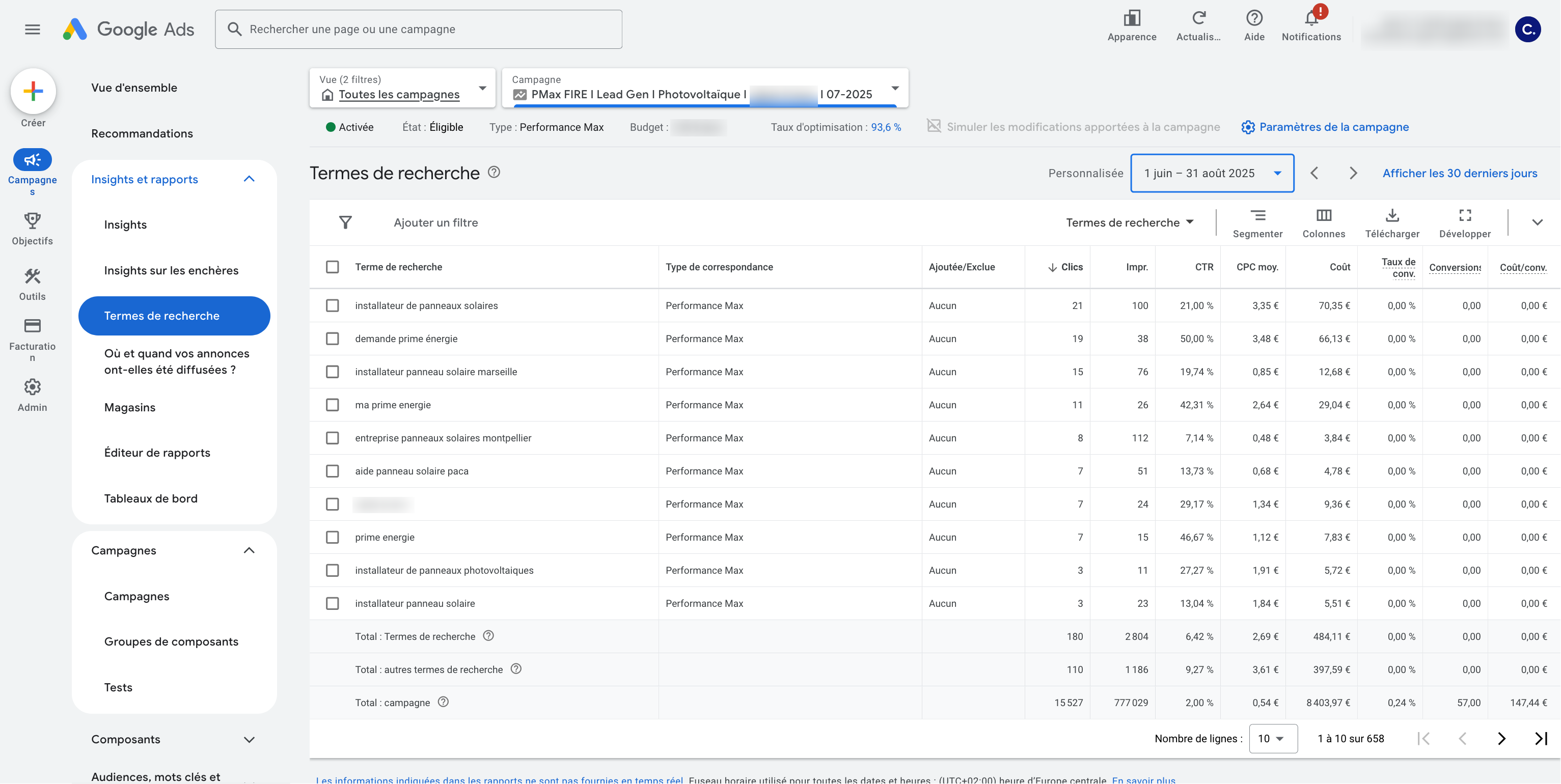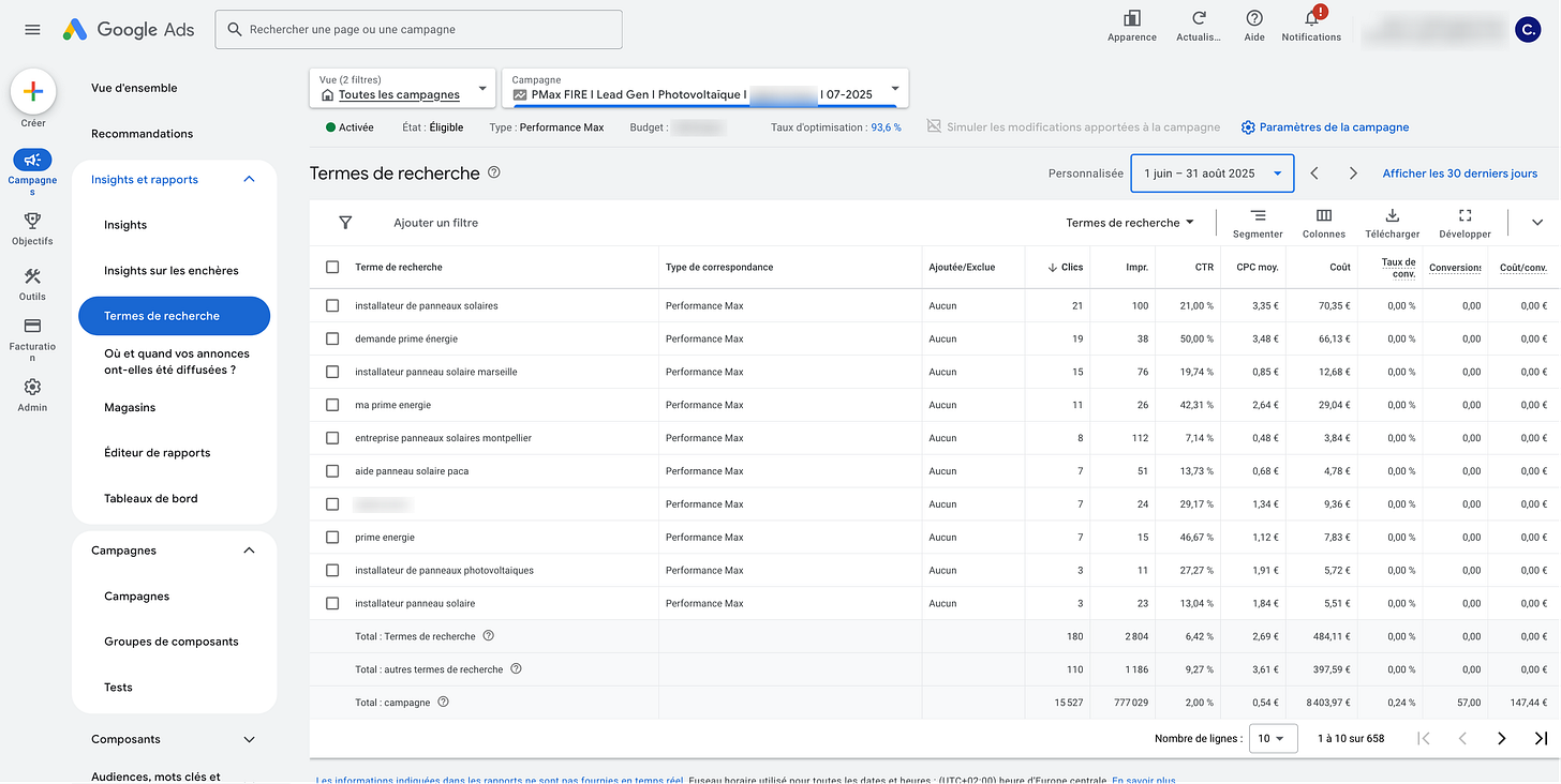 Rapport sur les termes de recherche d’une campagne Pmax Lead Gen (Secteur : photovoltaïque)