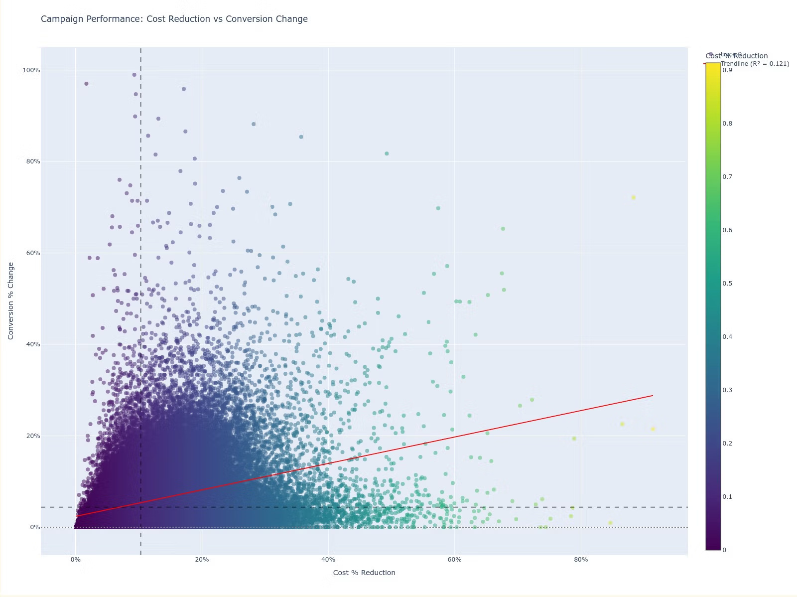 Axe horizontal (X) : c’est le pourcentage de réduction des coûts (% de baisse du CPC ou du budget).
